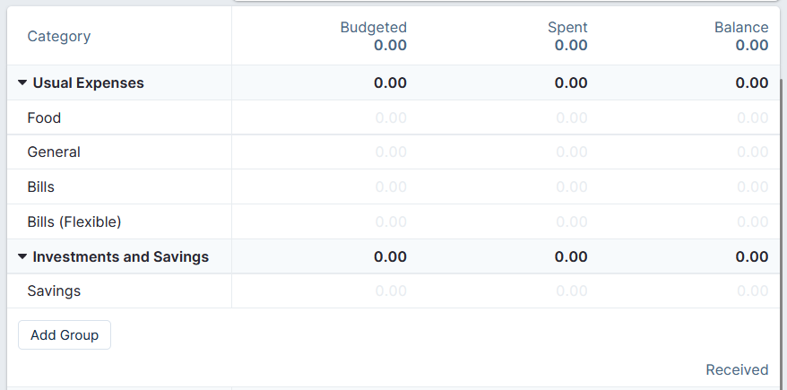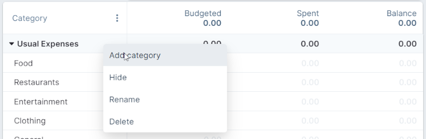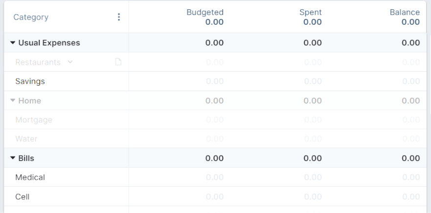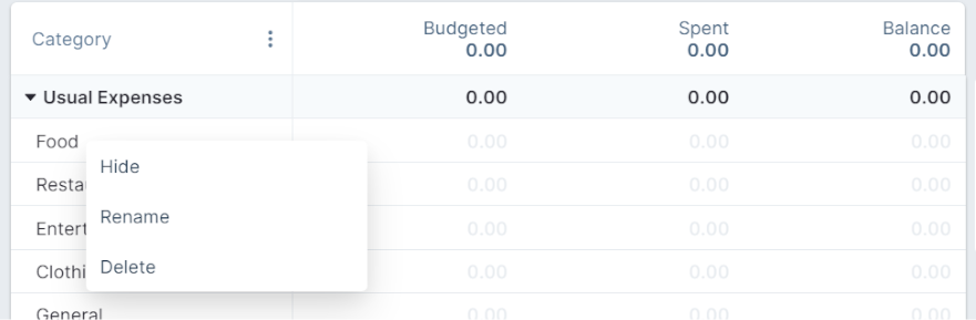 Categories that are not currently needed can be hidden by using the down arrow by each category name. An example is budgeting savings for a large cost (e.g. washing machine). After the purchase is made, the category can be hidden. Hidden categories still impact your budget. When needed, hidden categories can be viewed by clicking on the three dots at the top of the category list.