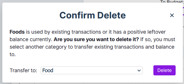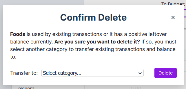 If the category you're deleting has a positive balance OR has been used for existing transactions you will be presented with a box to select which category the balance and/or transactions should be moved to.