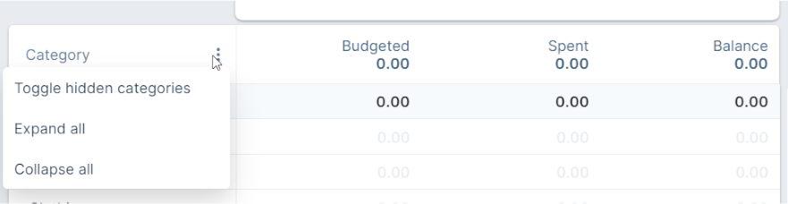 Category groups can be expanded or collapsed by clicking on the arrow to the left of the Category group name. All category groups can be expanded or collapsed at once by using the three-dot menu at the top of the category list.