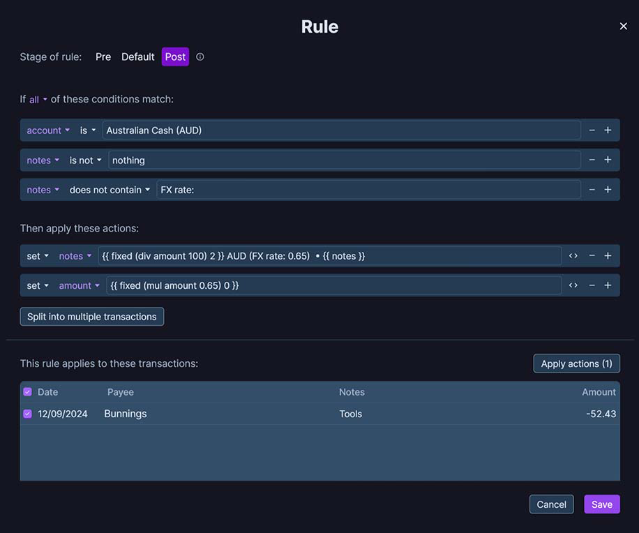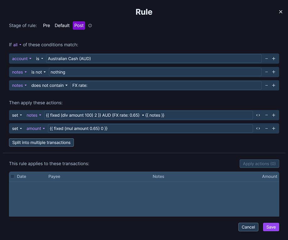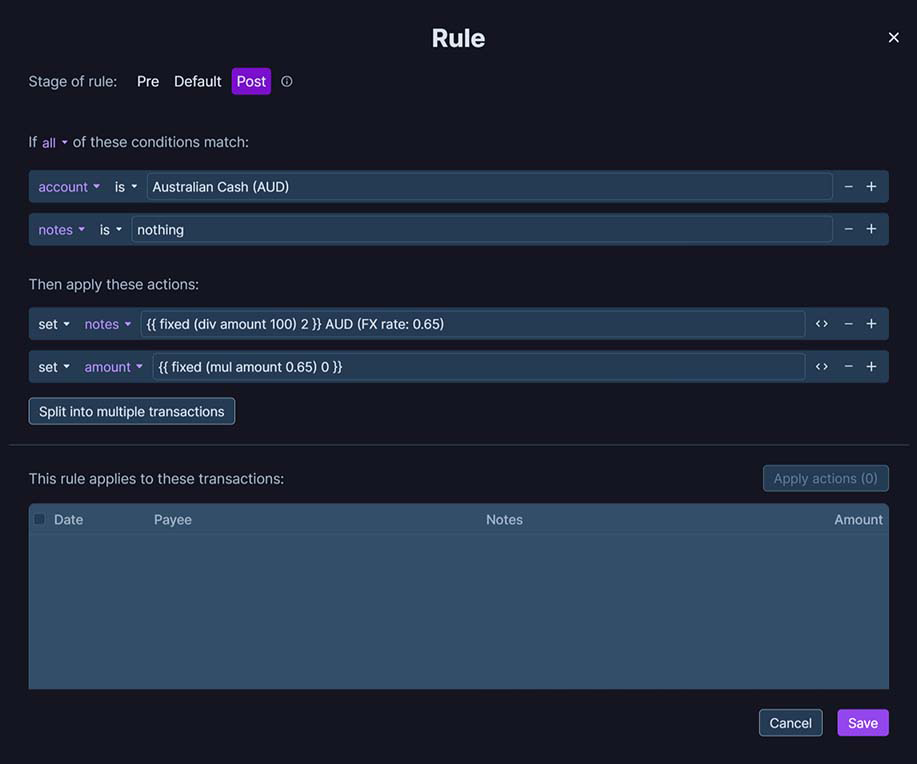 - set notes with this content: {{ fixed (div amount 100) 2 }} XXX (FX rate: FX_RATE), where XXX is the same currency code from the first rule.