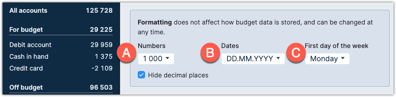 - Formatting numbers (indicated by the red box). We support most formats that are commonly used.