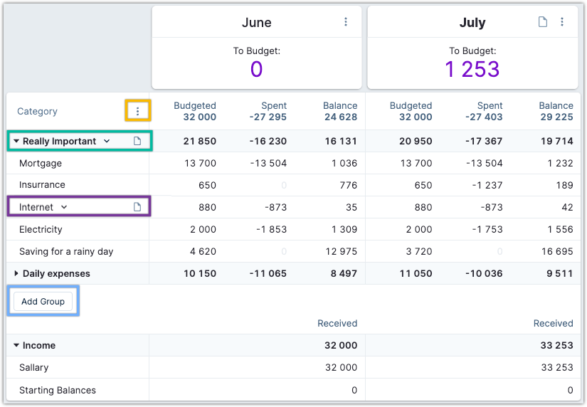 The budget detail section lists all your categories and their grouping. The image below shows two expense category groups, Really Important and Daily Expenses, along with the income categories. You can minimize a category group, as seen with Daily expenses.