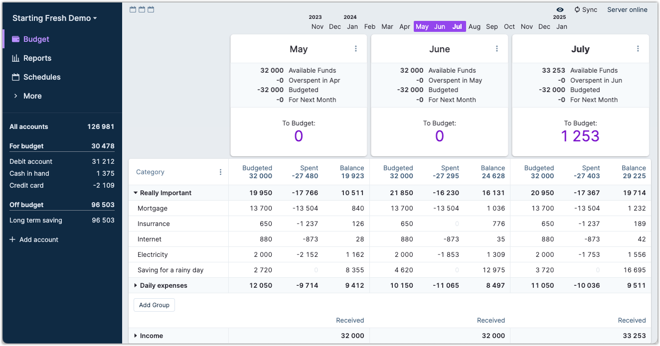 This view lets you manage your budget for various months. You'll find more information about how to do budgeting with Actual in the Budgeting part of this manual.