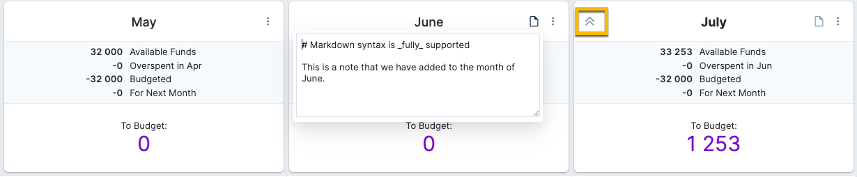 When you hover over a category group (outlined by the green box), you can add a note by clicking the note icon. As with the note icon in the top section, we also have full Markdown support here. The dropdown will allow you to add a new category, toggle hide or show the category group, rename a group, and delete the category group.