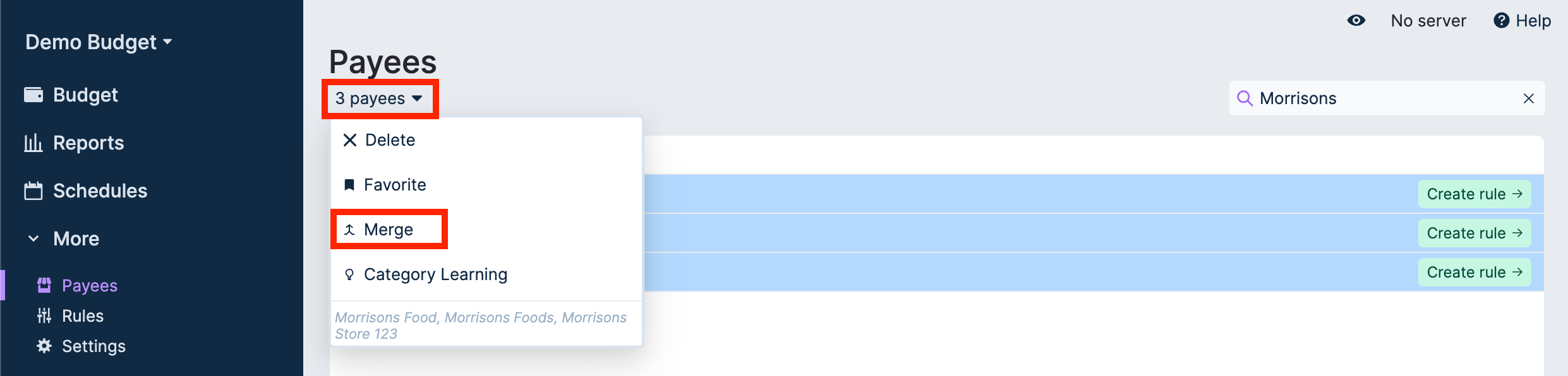 A powerful feature is merging payees. You may already have months worth of data and a lot of ugly Morrisons payees that all vary slightly. You want to merge all of these together into one payee.